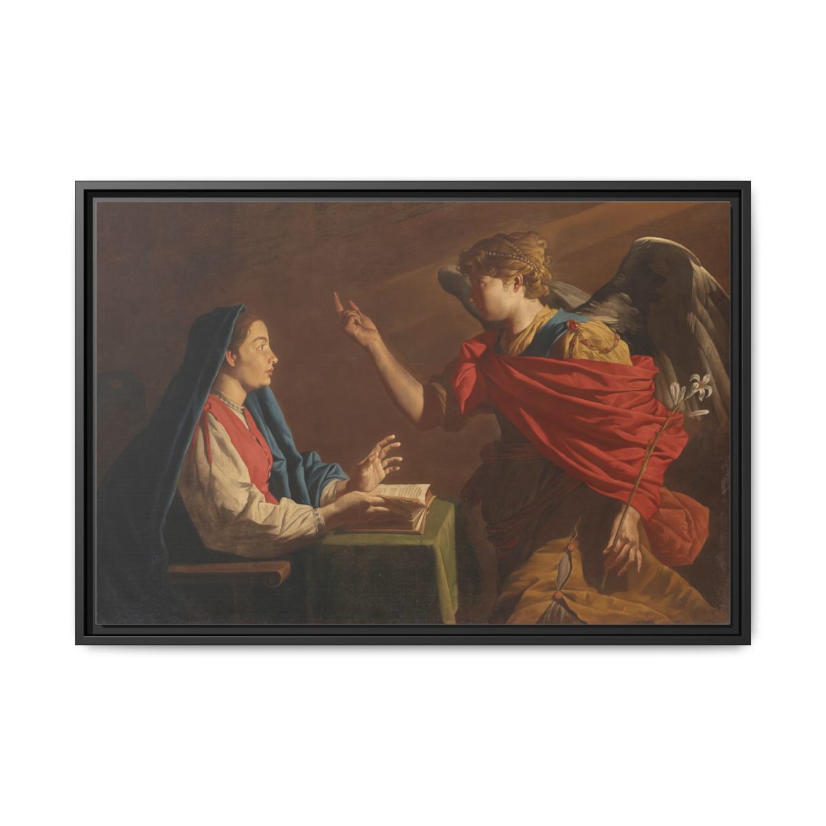 “Annunciation” (1655) by Nicolas Poussin is a Baroque oil painting depicting the angel Gabriel and Virgin Mary, symbolizing the biblical moment of Christ’s conception.